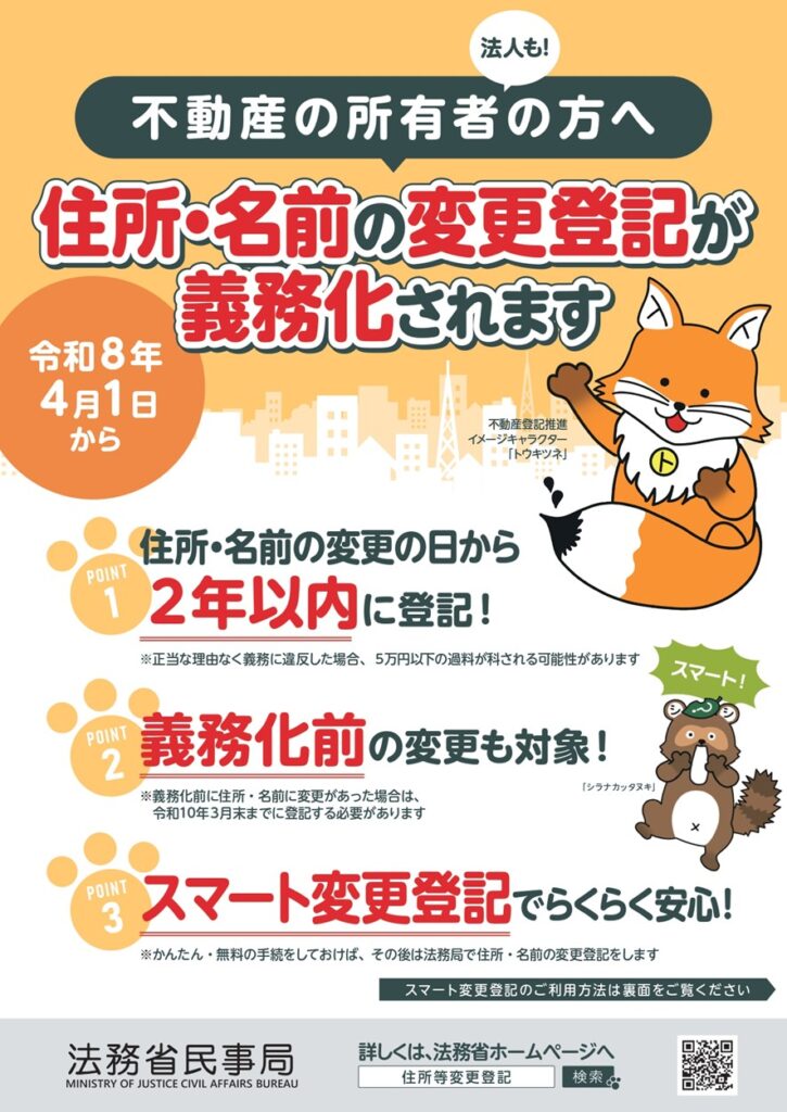 令和8年4月1日から、不動産の所有者は、住所・氏名・名称を変更した場合、変更日から2年以内に登記をしなければならないと法律で義務化されます。