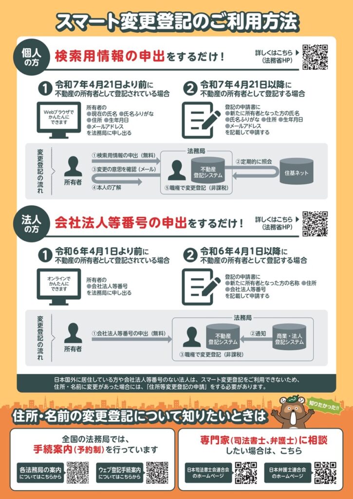 「スマート変更登記」は、自分で申請しなくても、法務局が職権で住所等の変更登記をしてくれる仕組みです。